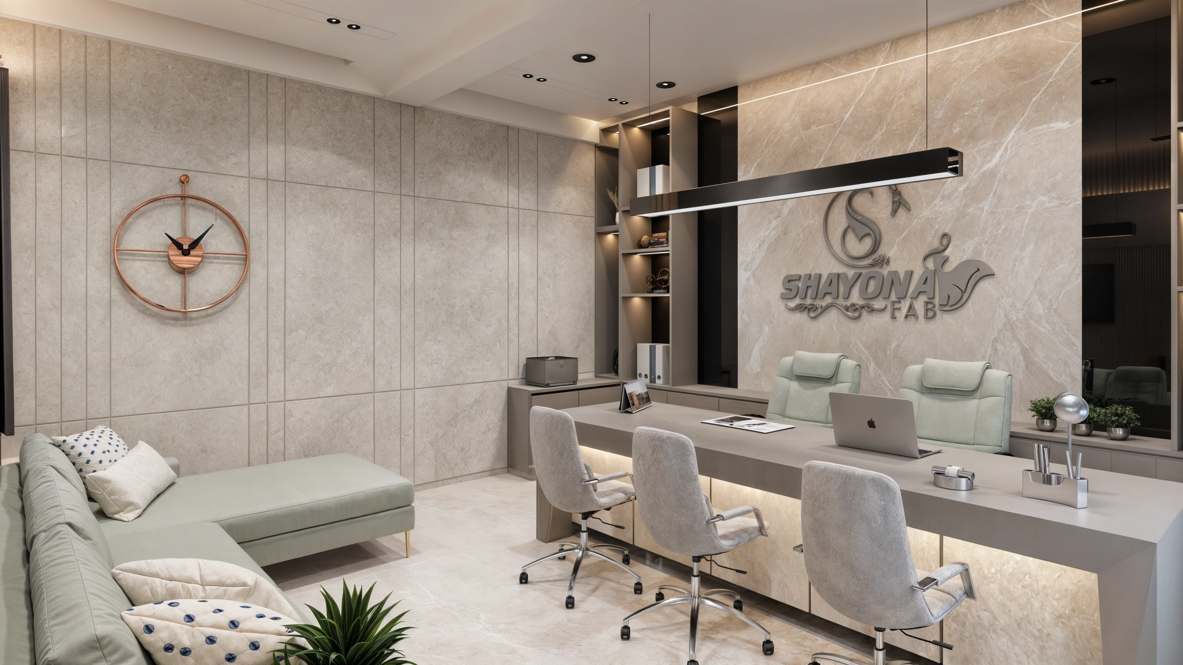 Hardik bhai’s Office brings together elegance and ease in a compact, modern workspace. Soft grays and greens paired with marble and textured walls create a calm, balanced setting. Layered lighting and gentle metallic touches add a hint of luxury, making the space feel both professional and comfortable to work in.