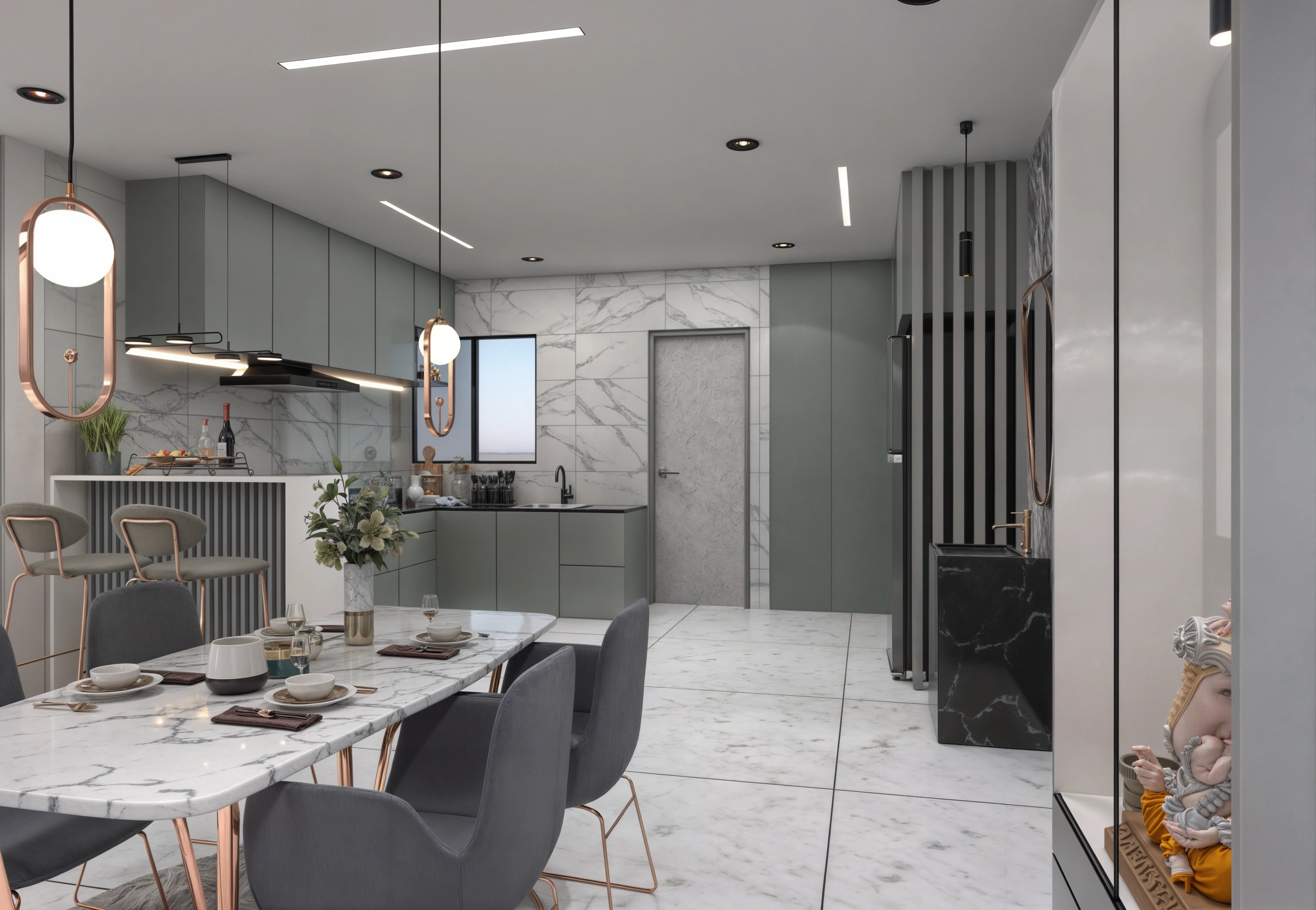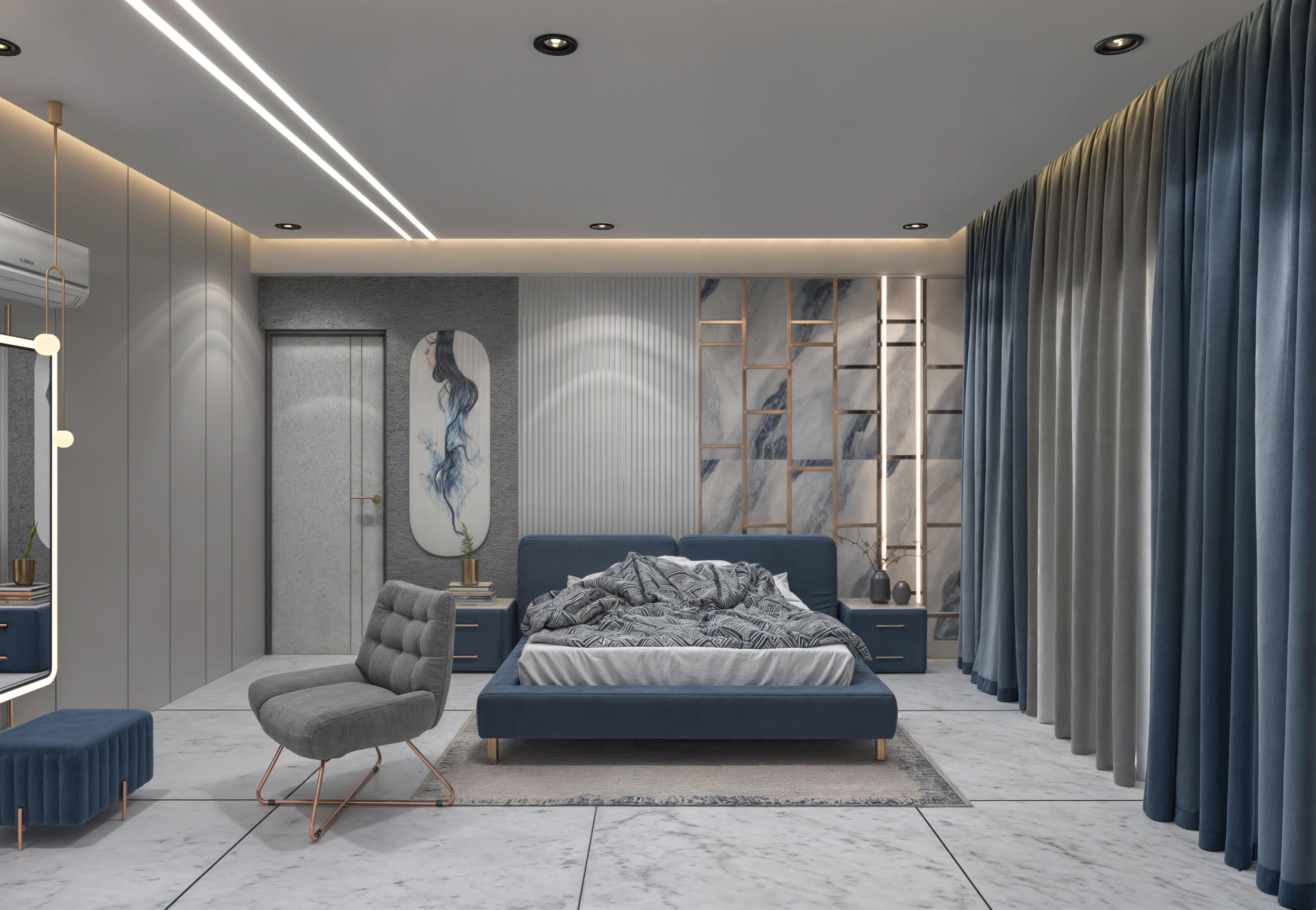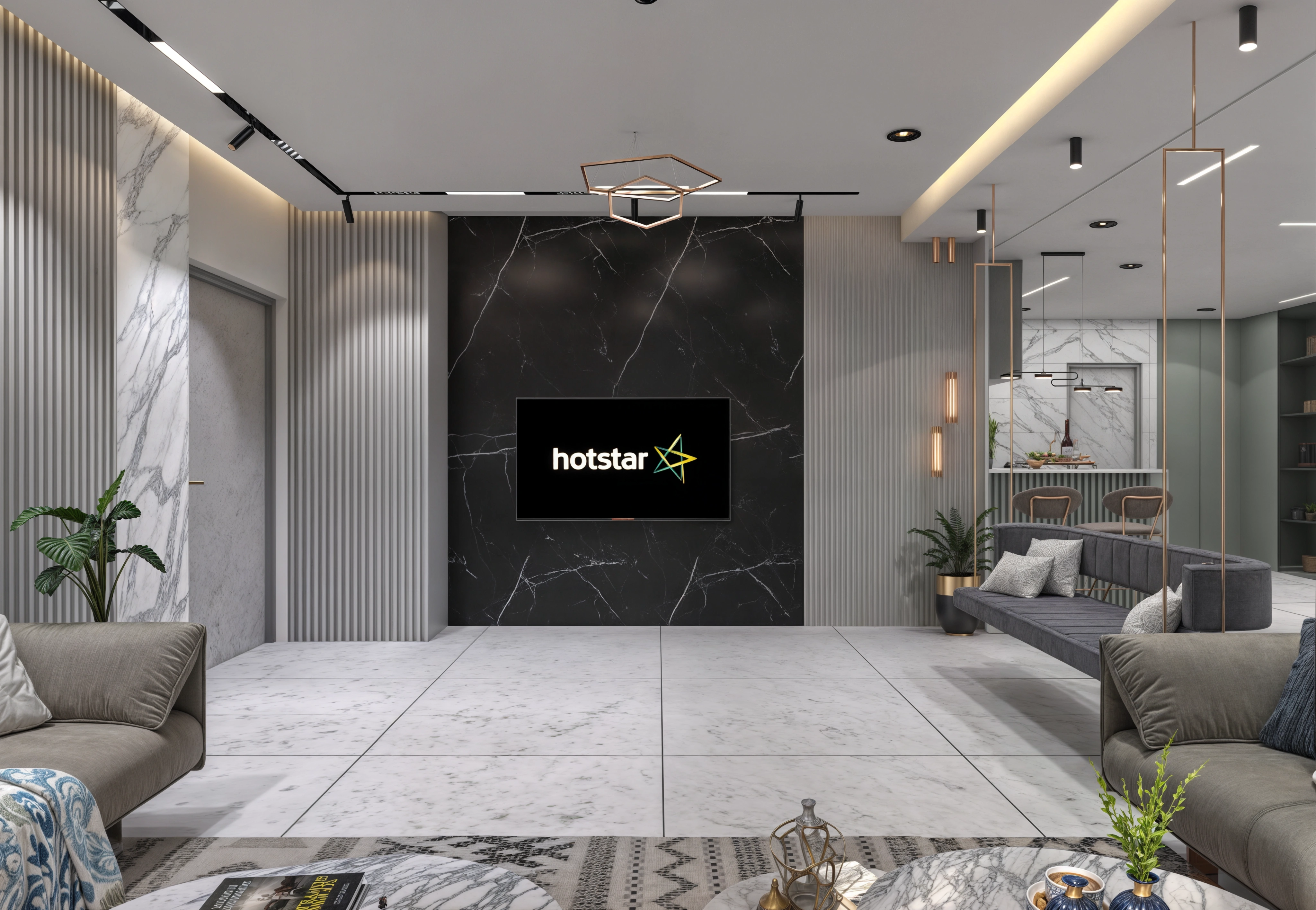 Custom furniture, integrated storage, and layered lighting come together